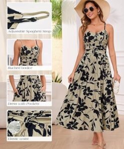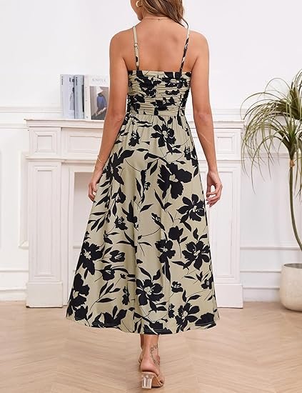 2025 Summer Fall Ruched Maxi Dress Adjustable Spaghetti Strap Floral Beach Long Sundress with Pockets