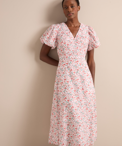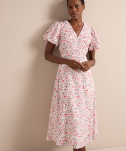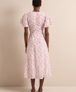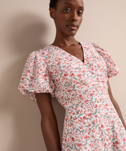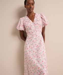 Elisa Silk Blend Midi Dress – Red Trailing Feather Print
