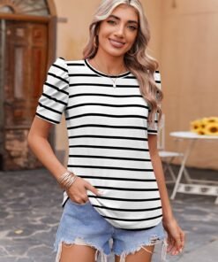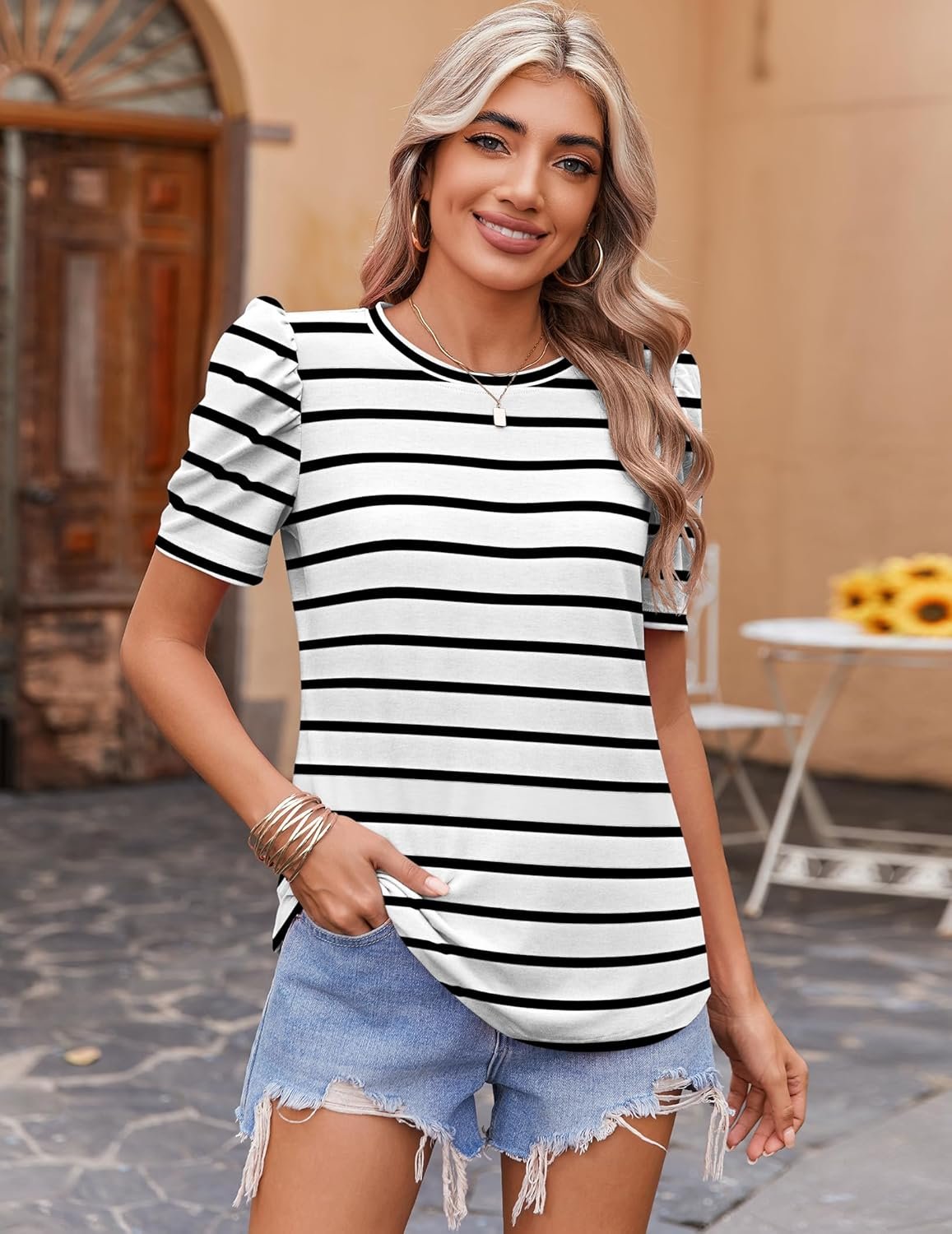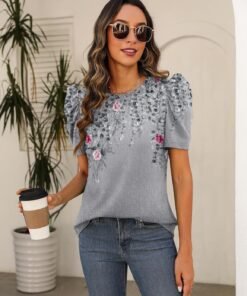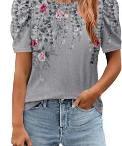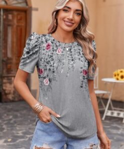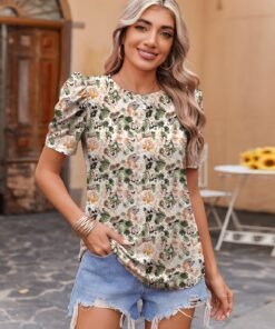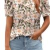 Zeagoo Blouse for Women Dressy Casual Puff Short Sleeve Boho Tops Fashion Floral Crew Neck Tunic Shirts Summer Clothes